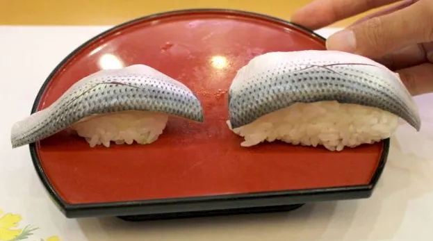 과거 에도 시대의 니기리즈시는 현대 스시와는 조금 다른 점이 있다. 한끼 식사용으로 거의 주먹밥 수준으로 네타의 크기와 샤리의 양 에서차이가 많이 났다. 그렇게 크다보니 손님들이 반으로 잘라서 달라는 요구가 나오면서 2피스씩 나오는 관습의 유래가 생겼다. 그것이 오늘날 회전 초밥에서 2피스씩 나오 이유이다.